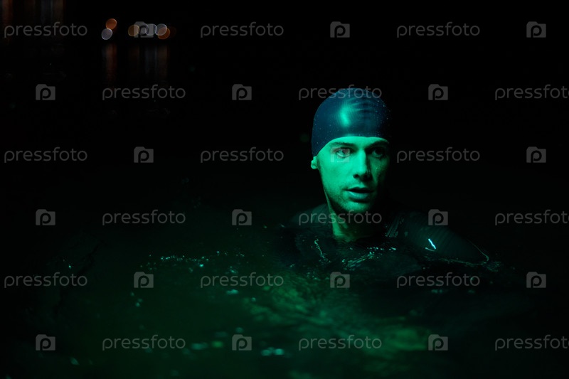 Настоящий пловец-триатлонист отдыхает во время интенсивной тренировки под ночным неоновым гелем