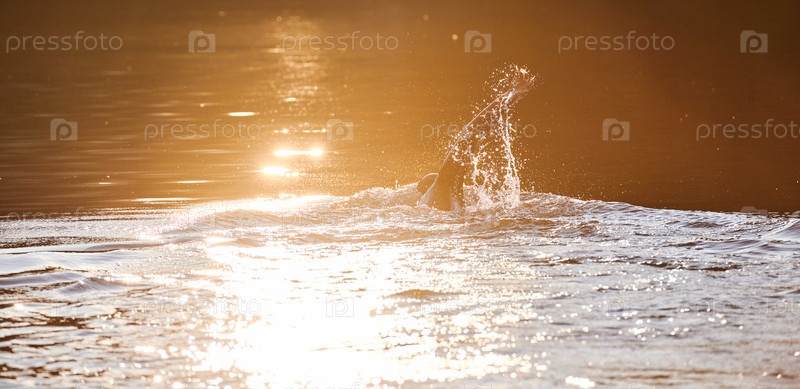 Триатлонист плывет по озеру на рассвете в гидрокостюме