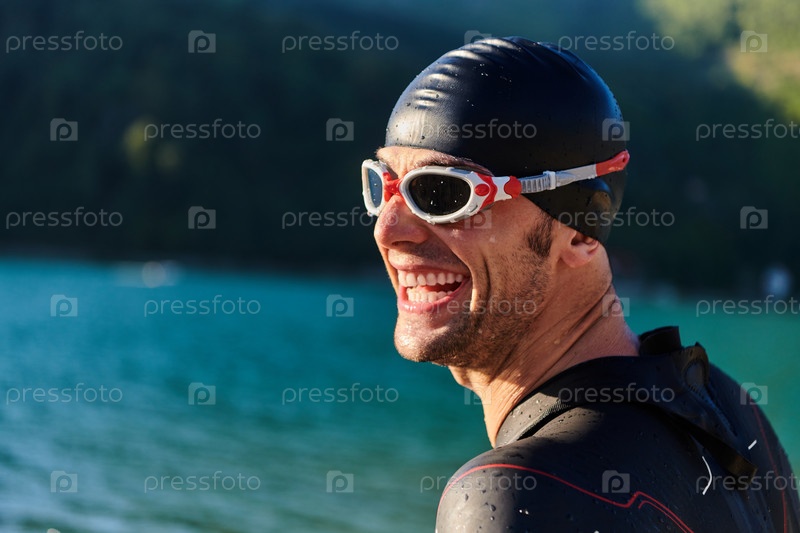 Настоящий триатлонист готовится к тренировке по плаванию на озере