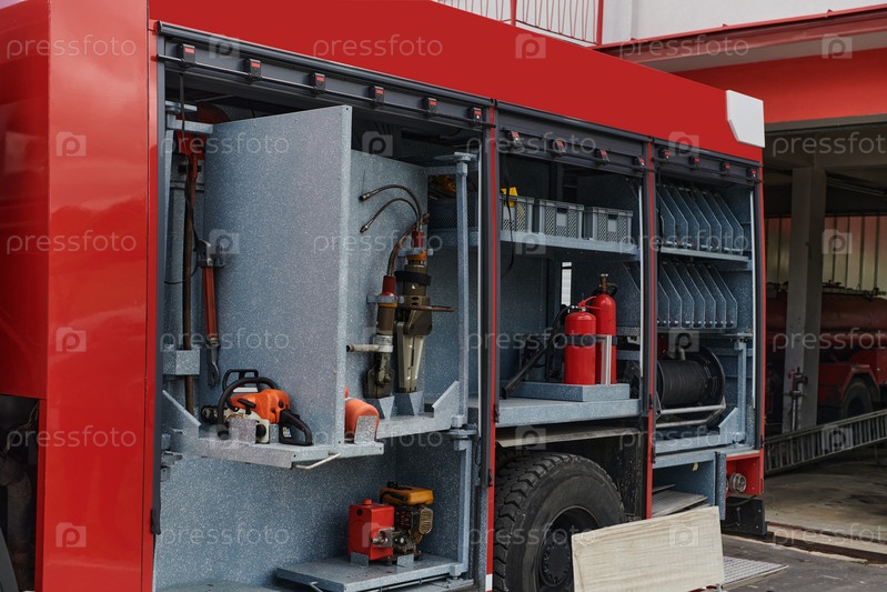 Крупный план основного противопожарного оборудования на современной пожарной машине, демонстрирующий инструменты и снаряжение, готовые к экстренному реагированию на опасные пожары