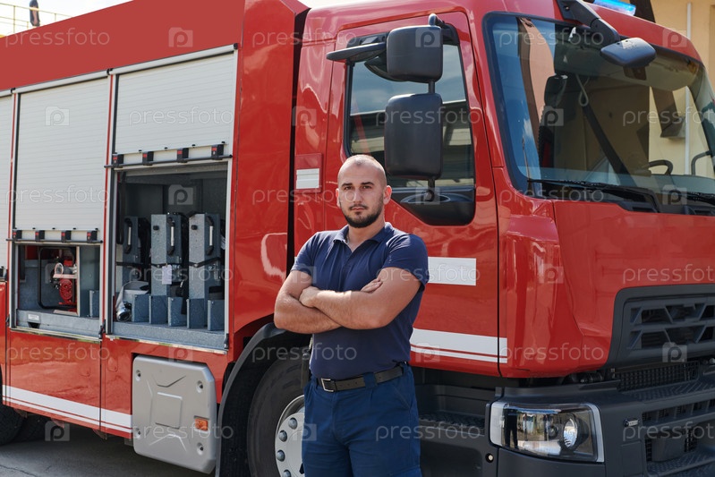 Уверенный в себе пожарный стоит со скрещенными руками, демонстрируя стойкость и готовность реагировать на чрезвычайные ситуации рядом с современной пожарной машиной, демонстрируя героизм и силу пожарной службы