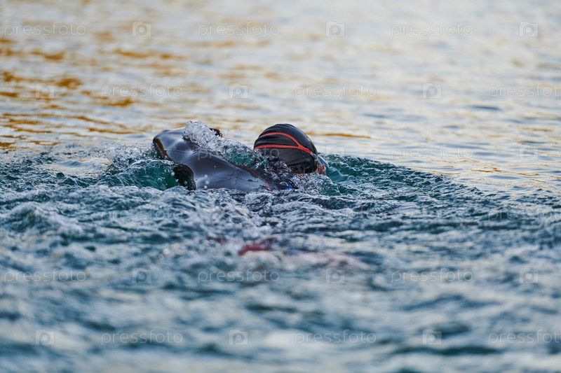 Триатлонист плывет по озеру на рассвете в гидрокостюме