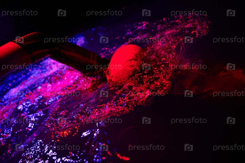Настоящий пловец-триатлонист отдыхает во время интенсивной тренировки под ночным неоновым гелем