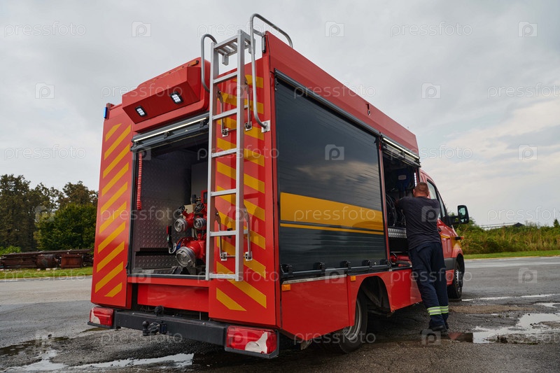 Современная пожарная машина, оснащенная передовыми спасательными технологиями, с опытной пожарной командой, готовой вмешаться и быстро отреагировать на чрезвычайные ситуации, обеспечивая безопасность и защиту общества