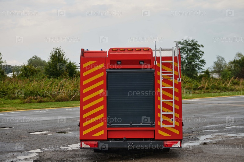 Современная пожарная машина, оснащенная передовыми спасательными технологиями, с опытной пожарной командой, готовой вмешаться и быстро отреагировать на чрезвычайные ситуации, обеспечивая безопасность и защиту общества