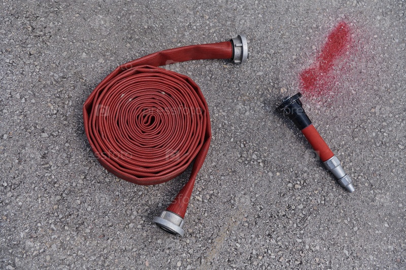 Свернутый пожарный шланг готов к действию на земле