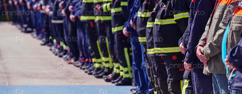 Группа пожарных выстроилась в шеренгу, отдавая честь флагу, аплодируя в знак солидарности и готовясь к интенсивным тренировкам, демонстрируя свою непоколебимую приверженность службе и командной работе