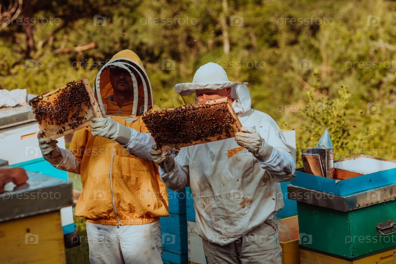 Пчеловоды проверяют мед на рамке улья в поле. Владельцы малого бизнеса на пасеке. Производитель натуральной здоровой пищи работает с пчелами и ульями на пасеке