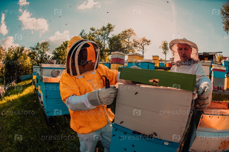 Пчеловоды проверяют мед на рамке улья в поле. Владельцы малого бизнеса на пасеке. Производитель натуральной здоровой пищи работает с пчелами и ульями на пасеке