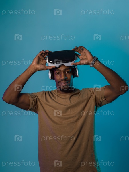 В футуристическом визуальном образе афроамериканец стоит в одиночестве на ярком синем фоне, украшенный очками виртуальной реальности, которые переносят его в передовой опыт виртуальной реальности, объединяющий технологии и инновации в современном представ