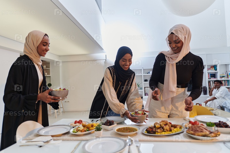 Группа молодых арабских женщин собралась вместе, чтобы с любовью приготовить ифтар во время священного мусульманского месяца Рамадан, воплощая в своих кулинарных творениях суть общинного единства, культурных традиций и радостного предвкушения
