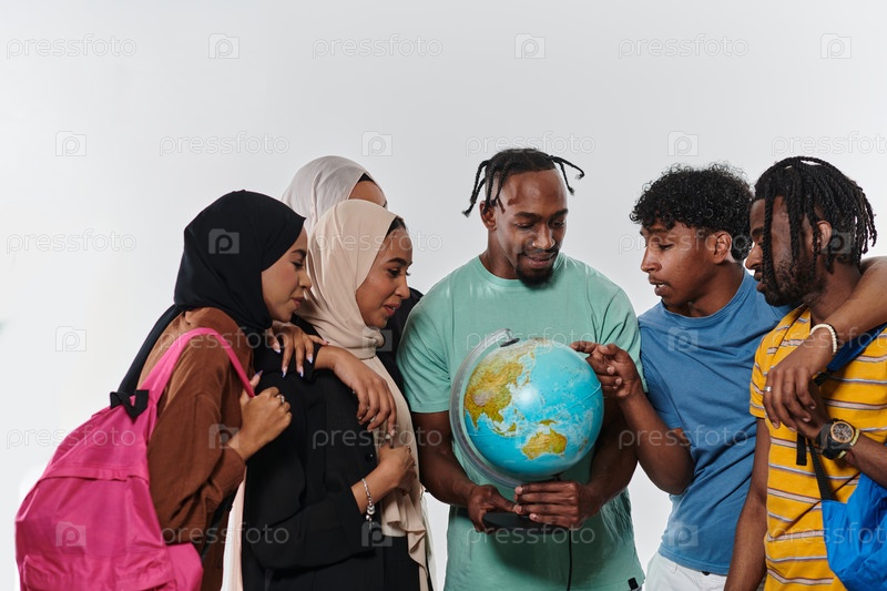 Разнообразная группа студентов собралась вокруг глобуса, поглощенная исследованием и учебой, их яркая энергия запечатлена на чистом белом фоне, символизирующем единство и любознательность в их образовательном путешествии