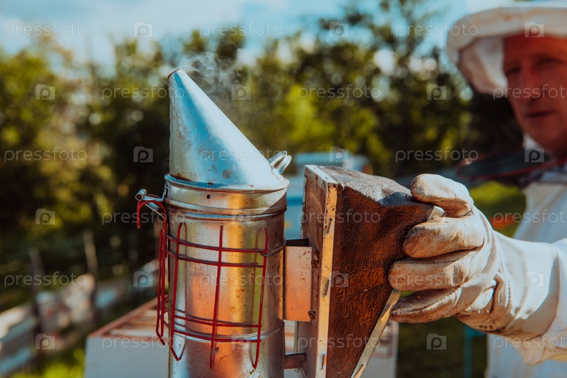 Пчеловод использует дым, чтобы успокоить пчел, и начинает осматривать мед