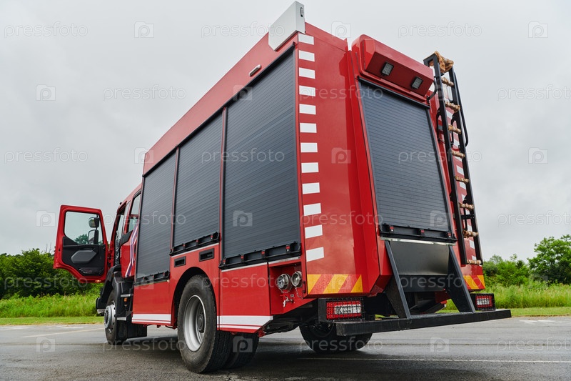 В этой захватывающей сцене современная пожарная машина, оснащенная передовыми спасательными технологиями, стоит наготове вместе со своей опытной пожарной командой, готовой вмешаться и быстро отреагировать на чрезвычайные ситуации, обеспечивая безопасность