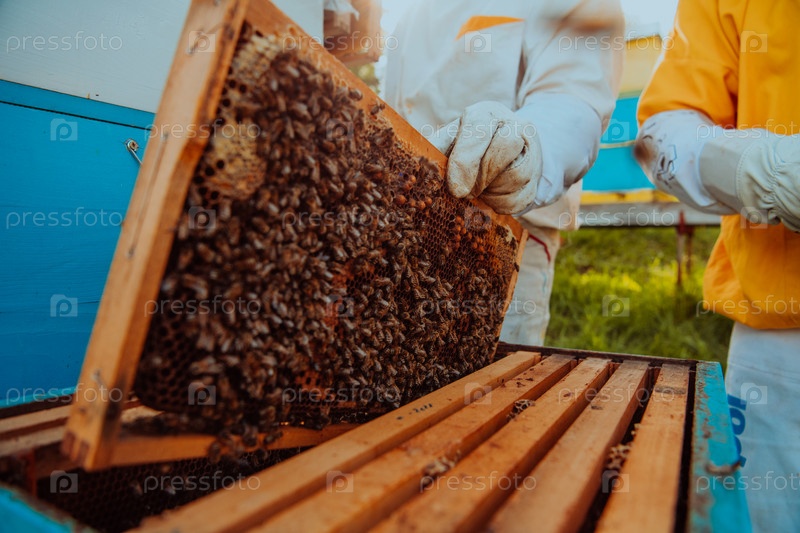 Пчеловоды проверяют мед на рамке улья в поле. Владельцы малого бизнеса на пасеке. Производитель натуральной здоровой пищи работает с пчелами и ульями на пасеке