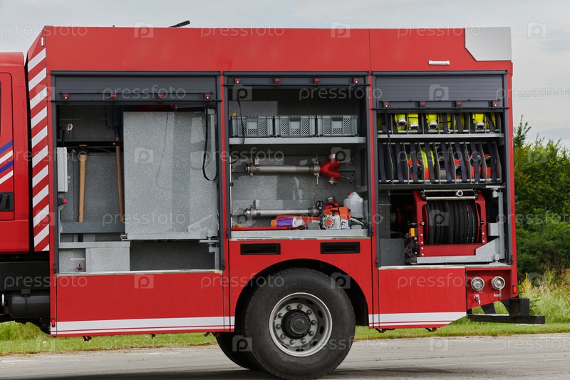 В этой захватывающей сцене современная пожарная машина, оснащенная передовыми спасательными технологиями, стоит наготове вместе со своей опытной пожарной командой, готовой вмешаться и быстро отреагировать на чрезвычайные ситуации, обеспечивая безопасность