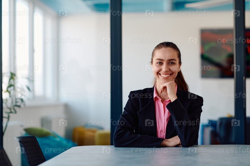 Успешная молодая женщина-лидер в костюме и розовой рубашке сидит в современном стеклянном офисе с решительной улыбкой