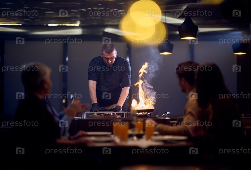В ресторане профессиональный шеф-повар представляет гостям жареный стейк, приготовленный на открытом огне, в то время как европейская мусульманская семья с нетерпением ждет ифтара во время священного месяца Рамадан, сочетая кулинарное мастерство с культур