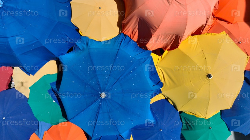 Вид с воздуха на разноцветные зонтики на итальянском городском рынке уличной еды