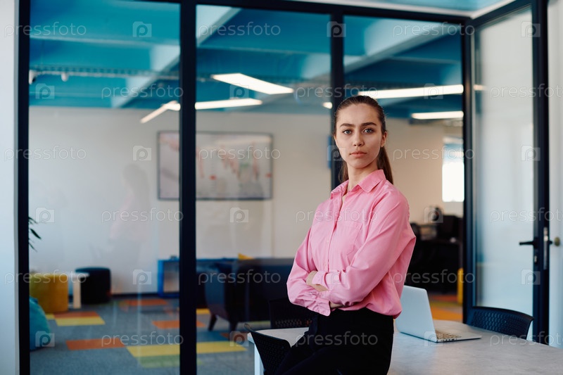 Портрет деловой женщины в креативном открытом пространстве коворкинга стартап-офиса со скрещенными руками. Успешная бизнес-леди стоит в офисе с копирайтом. На заднем плане работают коллеги