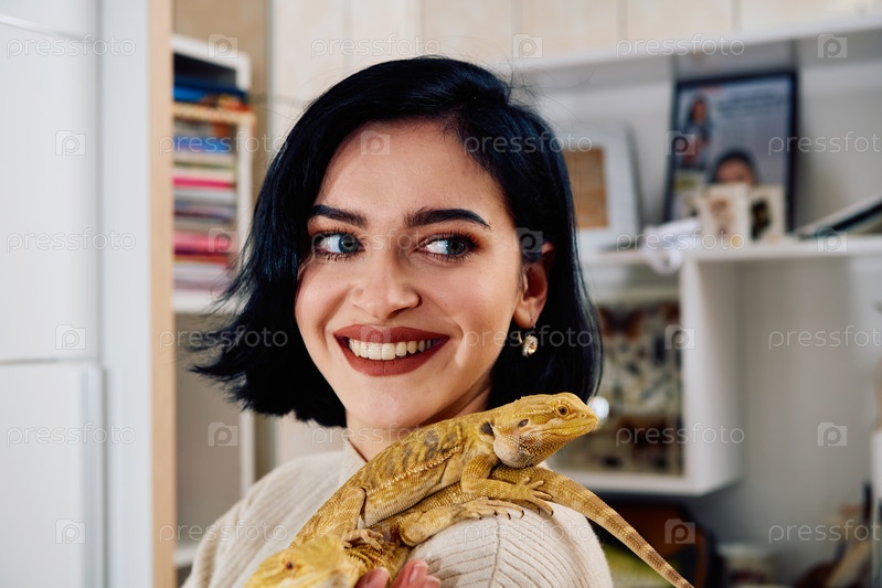 Красивая женщина позирует с двумя очаровательными питомцами — бородатыми агамами