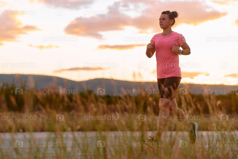 Решительный спортсмен бежит под солнцем на фоне прекрасной природы