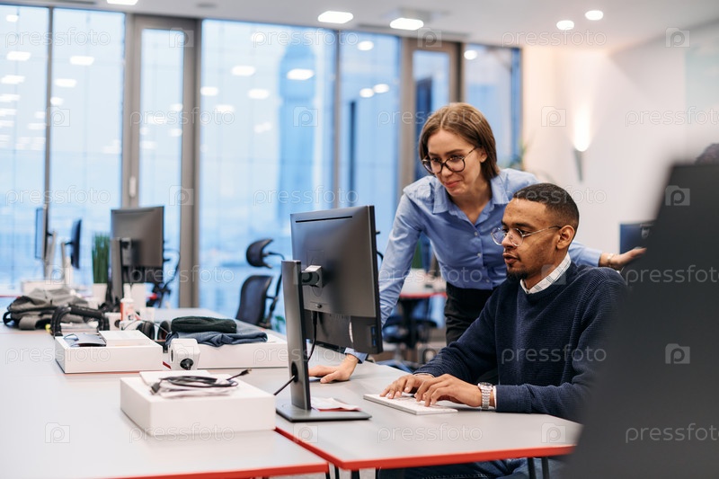 Цифровое сотрудничество: светловолосая бизнес-леди и ее партнер-афроамериканец просматривают документы онлайн