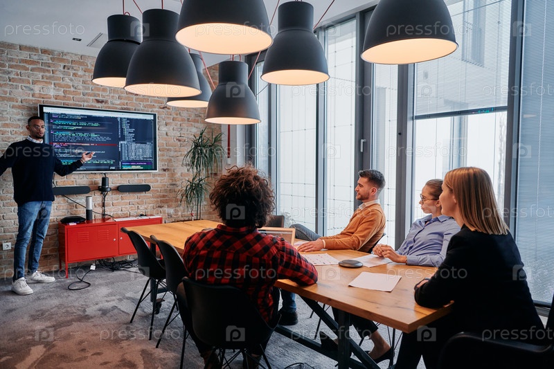 Афроамериканский бизнесмен проводит совещание, страстно представляя бизнес-план своей внимательной команде, способствуя сотрудничеству и стратегическому мышлению