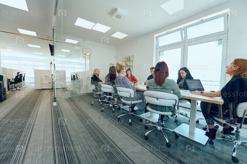 Разнообразная бизнес-группа обсуждает проекты в современном стеклянном офисе