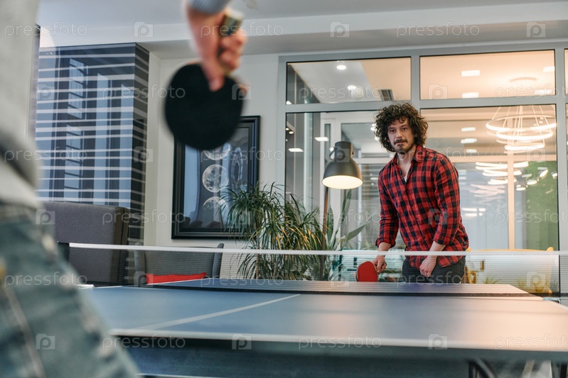 Коллеги по бизнесу отдыхают от работы, чтобы поиграть в настольный теннис, способствуя командной работе и товариществу на рабочем месте