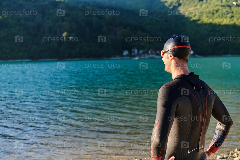 Настоящий триатлонист готовится к тренировке по плаванию на озере