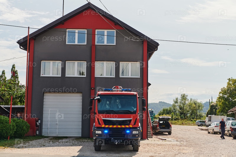 Современная пожарная машина, оснащенная передовыми спасательными технологиями, с опытной пожарной командой, готовой вмешаться и быстро отреагировать на чрезвычайные ситуации, обеспечивая безопасность и защиту общества