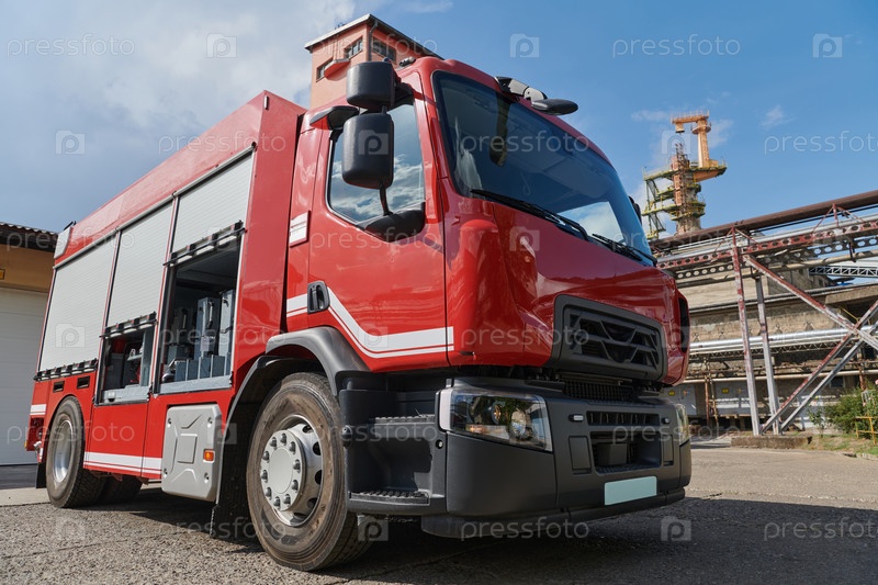 Современная пожарная машина, оснащенная передовыми спасательными технологиями, с опытной пожарной командой, готовой вмешаться и быстро отреагировать на чрезвычайные ситуации, обеспечивая безопасность и защиту общества