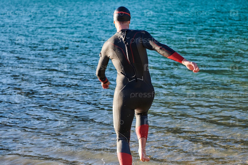 Спортсмен по триатлону начал тренировку по плаванию на озере
