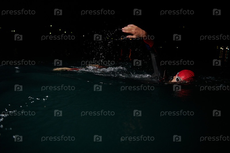 Целеустремленный профессиональный триатлонист проходит интенсивные ночные тренировки в холодной воде, демонстрируя самоотверженность и выносливость в рамках подготовки к предстоящим соревнованиям по триатлону