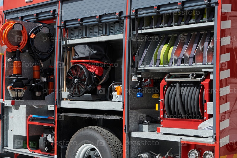 Крупный план основного противопожарного оборудования на современной пожарной машине, демонстрирующий инструменты и снаряжение, готовые к экстренному реагированию на опасные пожары