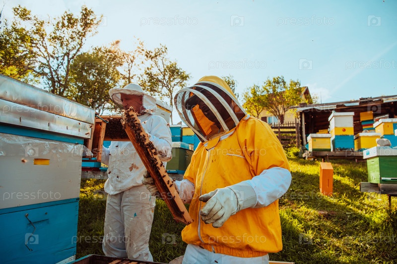 Пчеловоды проверяют мед на рамке улья в поле. Владельцы малого бизнеса на пасеке. Производитель натуральной здоровой пищи работает с пчелами и ульями на пасеке