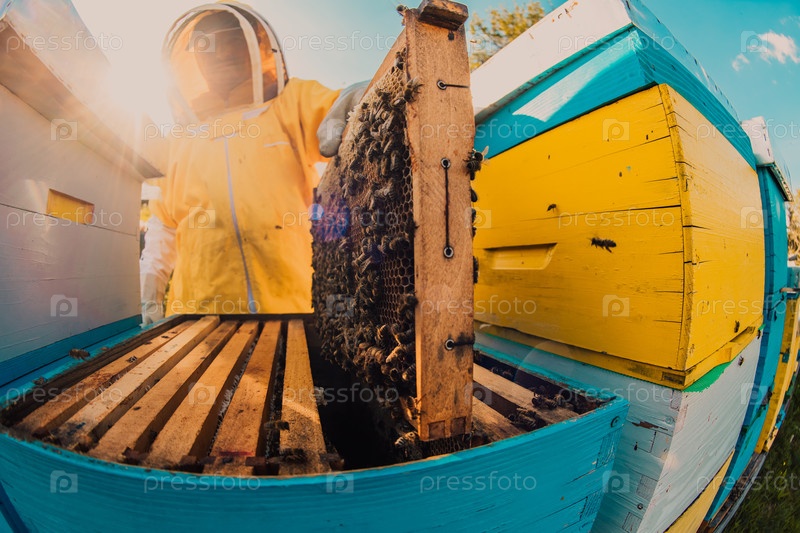 Пчеловод проверяет мед на рамке улья в поле. Владелец малого бизнеса на пасеке. Производитель натуральной здоровой пищи работает с пчелами и ульями на пасеке