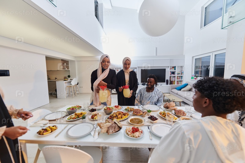 В священный месяц Рамадан мусульманская семья радостно собирается за столом, с нетерпением ожидая общего ифтара, участвуя в приготовлении общей трапезы и объединяясь в предвкушении коллективной молитвы, воплощая дух единения, преданности и культурного пра