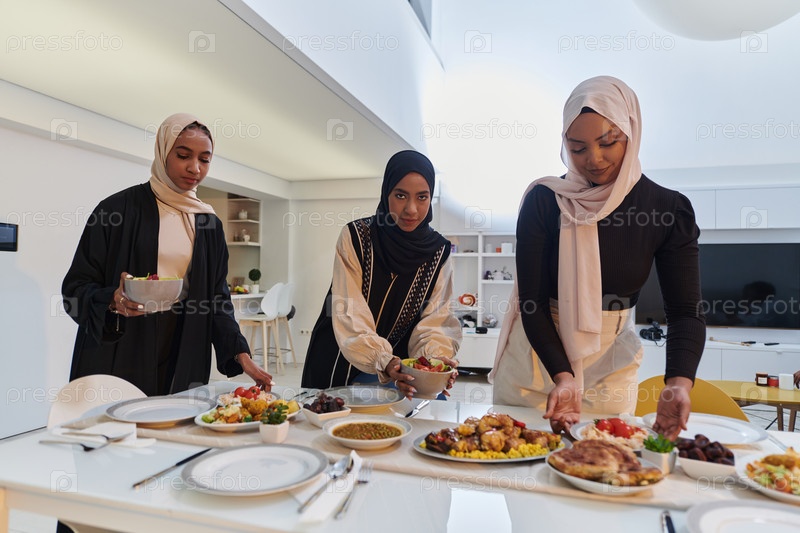 Группа молодых арабских женщин собралась вместе, чтобы с любовью приготовить ифтар во время священного мусульманского месяца Рамадан, воплощая в своих кулинарных творениях суть общинного единства, культурных традиций и радостного предвкушения