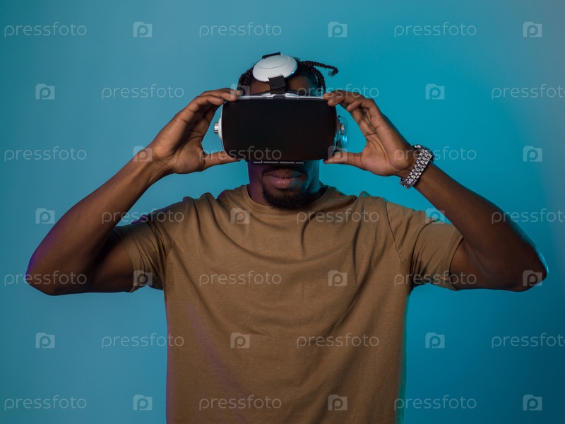 В футуристическом визуальном образе афроамериканец стоит в одиночестве на ярком синем фоне, украшенный очками виртуальной реальности, которые переносят его в передовой опыт виртуальной реальности, объединяющий технологии и инновации в современном представ