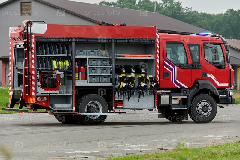 В этой захватывающей сцене современная пожарная машина, оснащенная передовыми спасательными технологиями, стоит наготове вместе со своей опытной пожарной командой, готовой вмешаться и быстро отреагировать на чрезвычайные ситуации, обеспечивая безопасность