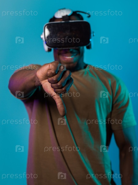 Афроамериканец в очках виртуальной реальности выражает недовольство, указывая рукой вниз, стоя в изоляции на синем фоне, изображая современную критику в захватывающем цифровом мире