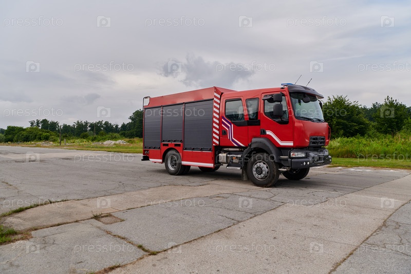 В этой захватывающей сцене современная пожарная машина, оснащенная передовыми спасательными технологиями, стоит наготове вместе со своей опытной пожарной командой, готовой вмешаться и быстро отреагировать на чрезвычайные ситуации, обеспечивая безопасность