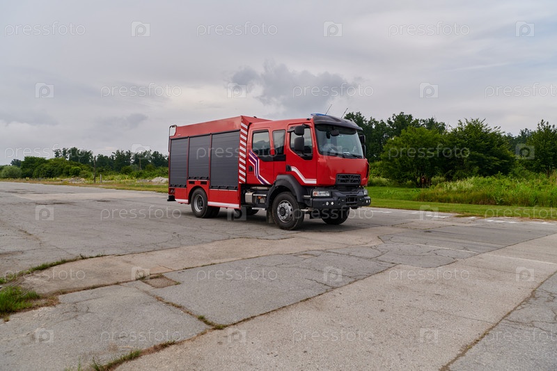 В этой захватывающей сцене современная пожарная машина, оснащенная передовыми спасательными технологиями, стоит наготове вместе со своей опытной пожарной командой, готовой вмешаться и быстро отреагировать на чрезвычайные ситуации, обеспечивая безопасность