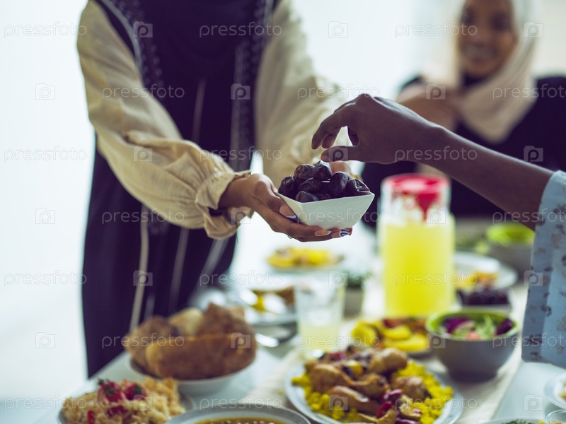 Женщина в хиджабе протягивает блюдо с финиками своей разношерстной семье, создавая атмосферу единства и радости, когда они собираются вместе, чтобы разговеться во время священного месяца Рамадан, символизируя общую любовь и духовную связь в рамках их куль