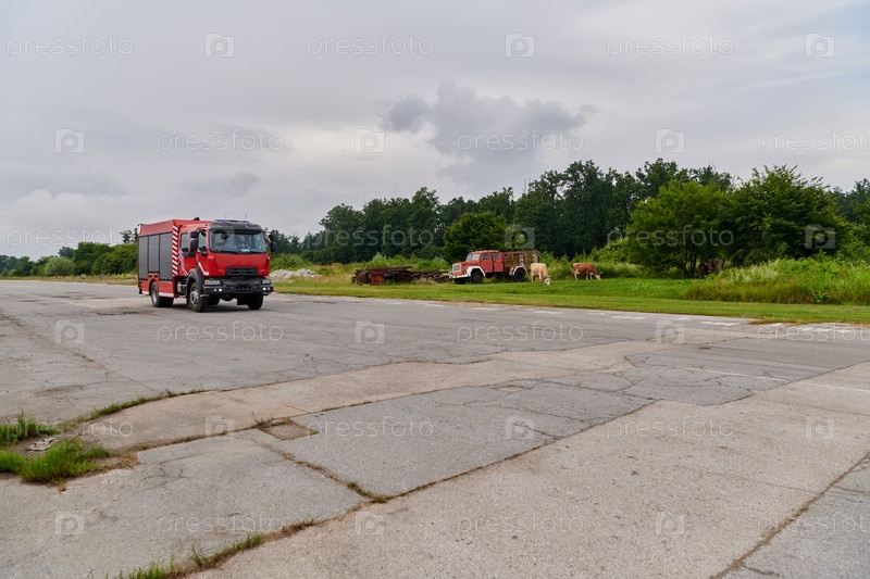 В этой захватывающей сцене современная пожарная машина, оснащенная передовыми спасательными технологиями, стоит наготове вместе со своей опытной пожарной командой, готовой вмешаться и быстро отреагировать на чрезвычайные ситуации, обеспечивая безопасность