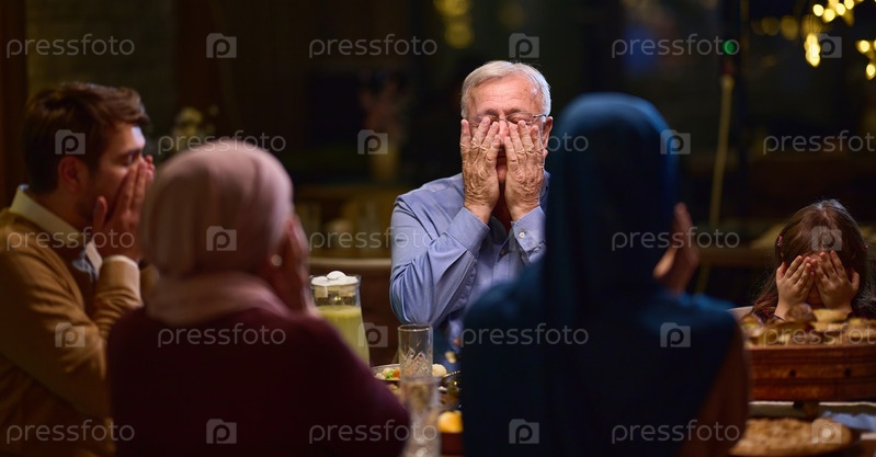 В современной обстановке ресторана европейская исламская семья собирается вместе на ифтар во время Рамадана, совершая молитву перед едой, объединяя традиции и современные обычаи в праздновании веры и семьи
