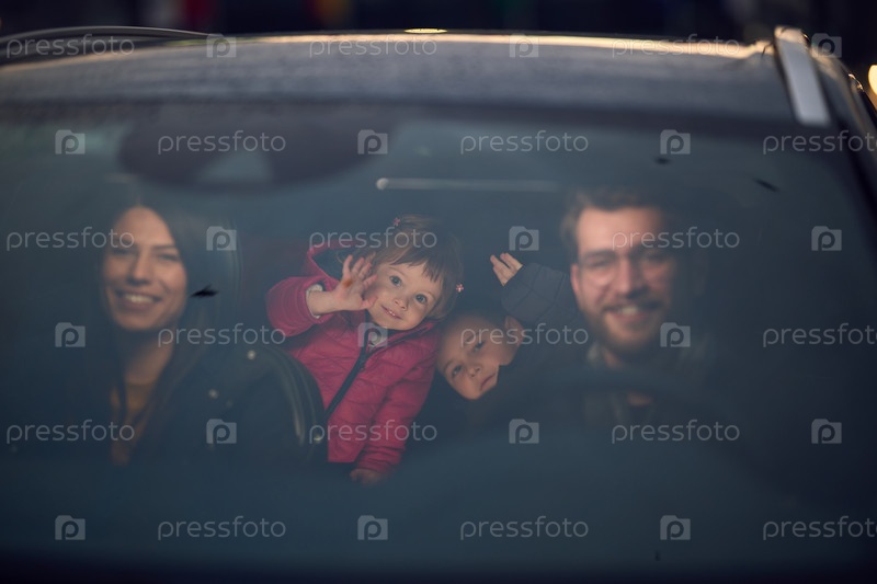 В ночные часы счастливая семья наслаждается игровыми моментами вместе в машине, путешествуя по ночной дороге, освещенной светом фар и наполненной смехом и радостью
