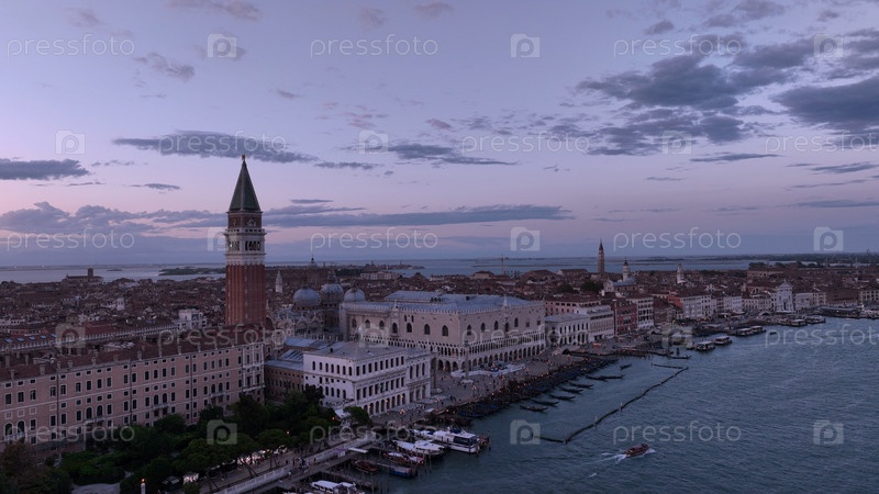 Панорамный городской пейзаж Венеции на закате или ночью, вид с воздуха на площадь Сан-Марко